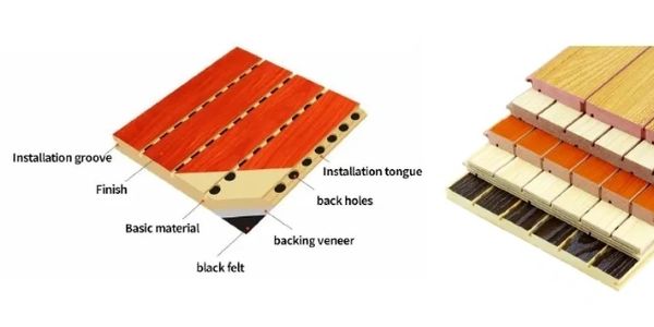 There are a lot of holes on the back of the wooden grooved acoustic panel . After the sound enters the holes, it will be randomly reflected in the inner wall of the structure, which is a bit like a sponge. It achieve effect of sound absorption by consuming the sound wave energy and turn it into the heat energy.